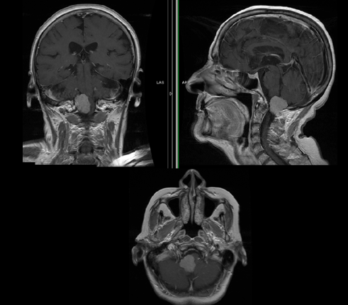 法国一位53岁男性,因三叉神经痛合并三叉神经感觉减退,在当地 神经外科医院 Lariboisiere医院,查出 左侧较大岩斜脑膜瘤 (27立方厘米)。脑磁共振(mri)显示从幕部可见明显的轴外肿...