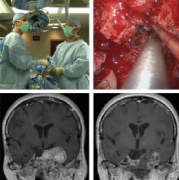 耳鼻喉科医生、头颈外科医生、神经眼科医生和神经外科医生代表重要外科团队。(左上和中间)我们的内窥镜鼻内入路手术套件有两个手术小组,神经外科和耳鼻喉科,放置在患者的两侧...
