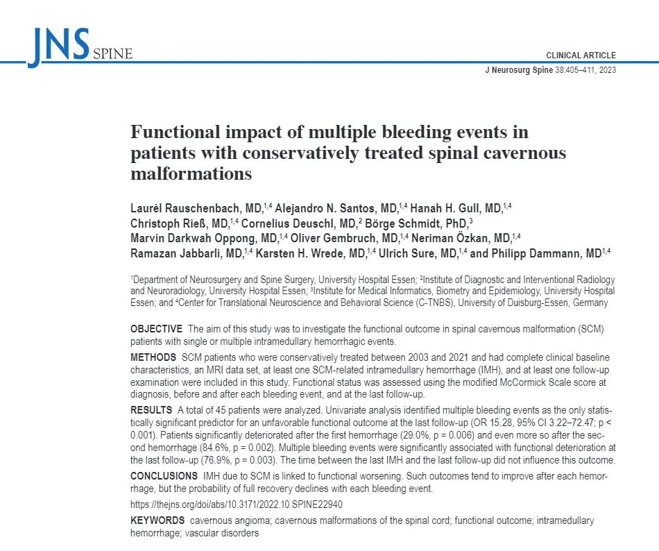 2022年《Journal of Neurosurgery》(《神经外科学杂志》)的一项研究更是戳中了患者的痛点:对2003-2021年保守治疗的脊髓海绵状血管瘤患者追踪发现,第二次出血后,患者神经功能会显著恶化;且出血次数越多,完全康复的可能性越低。