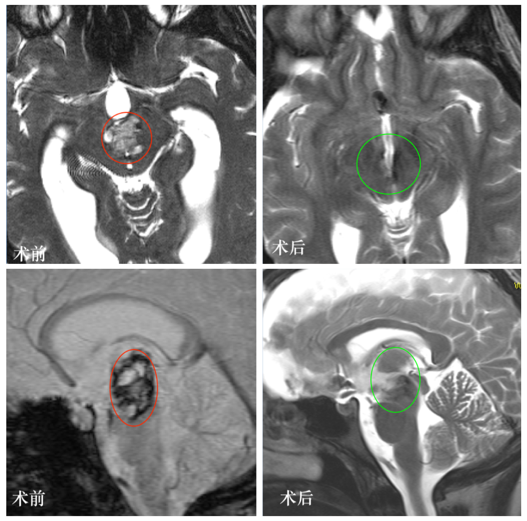 ·术后2年:患者已经完成学业,取得本科学位,工作、生活正常如意,复查颅脑MR显示病变全切、没有复发,无任何神经功能损伤。图:手术前后颅脑MR对比,术后MR中脑脑干病变全切,无脑组织损伤等。