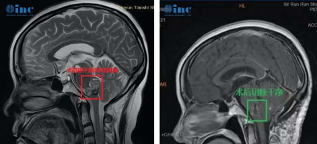 术前:因脑干中脑海绵状血管瘤引起严重脑干出血、生命垂危,当地ICU住院2月保守治疗后好转,并行了脑积水分流手术,8年左右发生4次脑干出血,当地医生告知该位置病变手术风险较大、只能保守观察治疗。遂奔赴德国寻求巴教授手术。