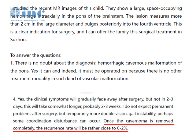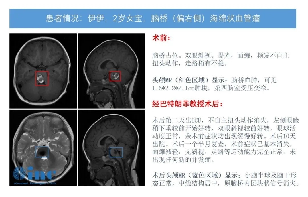 很快,巴教授给出了让伊伊父母喜出望外的评估结果——孩子具有明确的手术指征,对于这种脑干部位的海绵状血管畸形只有通过手术可以合适治疗,一旦完全切除海绵状血管瘤,复发率仅仅为0-2%。可为孩子在国内手术,手术切除率可达到99-全切,小患者无需长途飞机出国治疗。