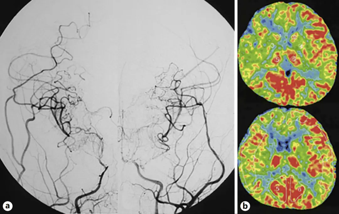 数字减影血管造影(DSA)显示双侧颈内动脉末端、大脑前动脉近端及大脑中动脉严重狭窄。(如图a,就像三条主干道同时堵车,脑组织正在“缺氧”的边缘挣扎。)
