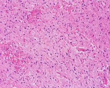 毛细胞星形细胞瘤通常表现为紧密致密细胞被疏松区域和微囊中断的双相外观。(苏木精和曙红,10倍原始放大。)