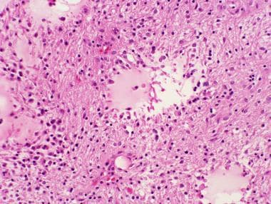 毛细胞星形细胞瘤疏松区放大倍数更高。(苏木精和曙红,20倍原始放大倍数。)