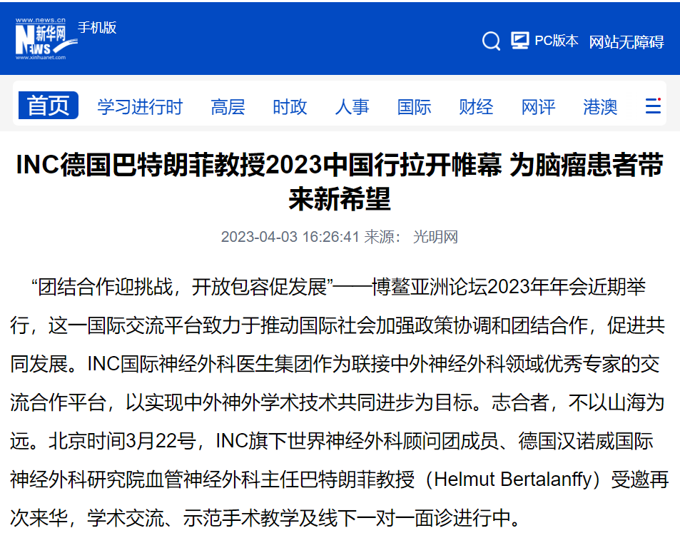 “团结合作迎挑战,开放包容促发展”——博鳌论坛2023年年会近期举行,这一国际交流平台致力于推动国际社会加强政策协调和团结合作,促进共同发展。INC国际神经外科医生集团作为联接中外神经外科领域专家的交流合作平台,以实现中外神外学术技术共同进步为目标。志合者,不以山海为远。北京时间3月22号,INC旗下国际神经外科顾问团成员、德国汉诺威国际神经外科研究院血管神经外科主任巴特朗菲教授(Helmut Bertalanffy)受邀再次来华,学术交流、示范手术教学及线下一对一咨询进行中。