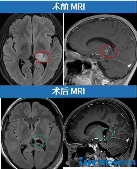 手术难点:位置深,MRI显示左侧丘脑占位性病变,弥漫性生长、侵入脑实质。