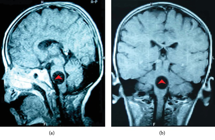 图1,非对比T1加权磁共振成像显示圆形,边界清楚,等信号囊肿(红色箭头)。矢状图像。冠状图像。