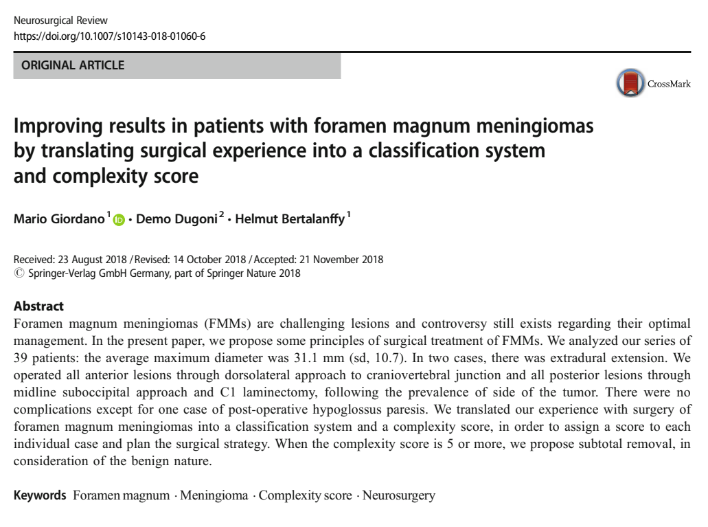 巴特朗菲教授研究团队考虑将枕骨大孔脑膜瘤归类为一个分类系统和一个复杂度评分,以便为每个评分的患者制定个性化的手术策略。当复杂度得分为5或更高时,巴特朗菲教授考虑到为良性建议进行次全切除。