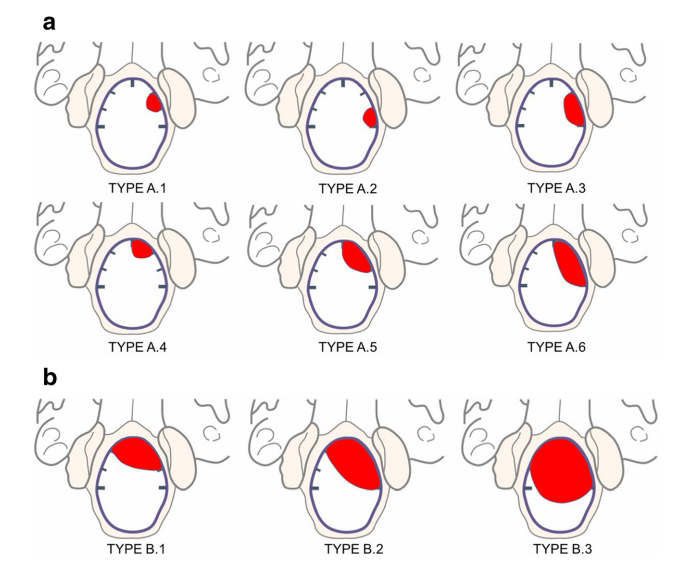 八个纯前病变和25个前外侧病变。前外侧肿瘤被分为12个A型肿瘤和13种B型肿瘤。