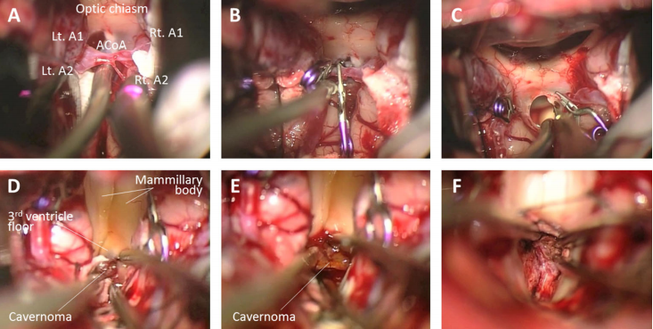 上图示意术中分离前交通动脉。图A-C表示使用微型夹子,同时保留前交通动脉的射孔支,随后在两者之间进行了分离。图D-F表示切掉薄片后纵向终端,打开在乳头体之间的三脑室底部。裸露的中脑海绵状血管瘤完全去除。Rt,右;Lt,左;A1为A1脑前动脉节段;前A2为A2节段脑动脉
