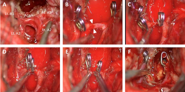 图6表示术中照片分割前交通动脉(ACoA)。由于前交通动脉出乎意料地被割裂了,前路A1节段脑动脉(A1)暂时阻塞流量控制。撕裂点(在白色箭头之间)的前交通动脉被迷你夹闭塞住,剪开,然后进行分割。Rt,右;Lt,左;A2,A2段脑前动脉