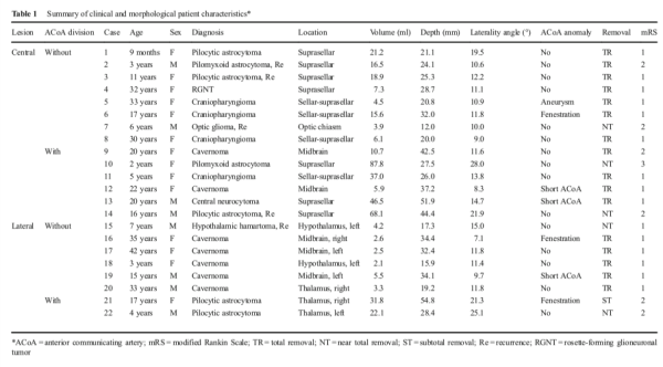 全部患者的临床和形态特征均为总结于表1。十四例患者在中心,八个是外侧病变。在全部22例患者中,有8例(6例和2个有侧部病变的患者)进行了前交通动脉分割,而14名患者(8名有中心病变,6名有侧部病变)做了不需要这种动脉中断。在一名患者中,3毫米偶然发现ACoA动脉瘤,并在切除肿瘤后通过手术夹钳进行治疗(病例5)。16例患者完全切除,5例几乎全部切除(超过肿瘤体积的90%),小计切除(在肿瘤体积的50%到90%之间)1个人。幸运的是,没有与之相关的严重的早期或晚期并发症发生外科手术或ACoA分区。中位数出院时改良的Rankin量表(mRS)评分为2(IQR,1-2)接受ACoA分割且为1的患者(IQR,1-1)在没有动脉中断的患者中。出院时发现ACoA部门和非部门患者之间的mRS评分存在差异(P=1.22)。相反,比较每个组中ACoA分离组和分离组的三种肿瘤特性中央和外侧病变分别导致有趣发现。肿瘤体积与ACoA无关中央(P=0.06)或侧面(P=0.13)划分病变组(表2)。但是,在中央病变组中肿瘤深度与ACoA划分显着相关(P=0.01)(表2),而在外侧病变组中,肿瘤侧倾角与ACoA划分(P=0.04)。