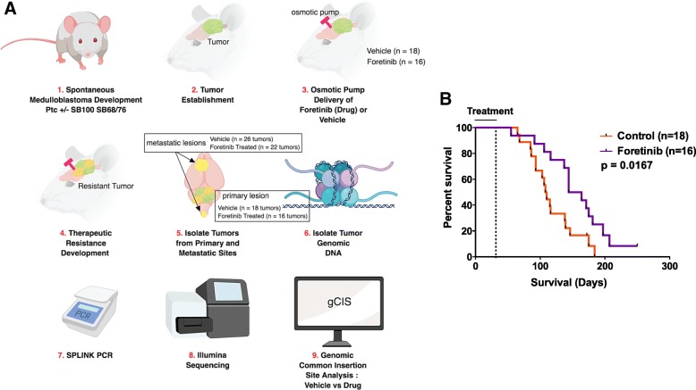 自发发展为具有100%渗透率的原发性和转移性的髓母细胞瘤Sleeping Beauty转座子诱变小鼠模型(Ptch+/-,SB100/SB68,T2Onc)被用于确定Foretinib耐药性的途径(图1a)。该系统允许包埋癌基因和抑癌基因,这可以通过转座子插入位点的下一代测序来鉴定。先前我们证明了Foretinib是SHH和3组髓母细胞瘤小鼠模型中MET途径的合适控制剂(图1b)。在30-35天的时间范围内建立肿瘤后,通过连续渗透泵以每小时0.25μl的速度向脑脊液中输注28天,用溶媒或Foretinib治疗小鼠(图1a)。收集抗药性的原发性和转移性肿瘤,并通过SPLINK PCR结合末端Illumina高通量测序鉴定基因组共同插入位点(gCIS)(图1a),以查明治疗耐药性的遗传驱动因素。