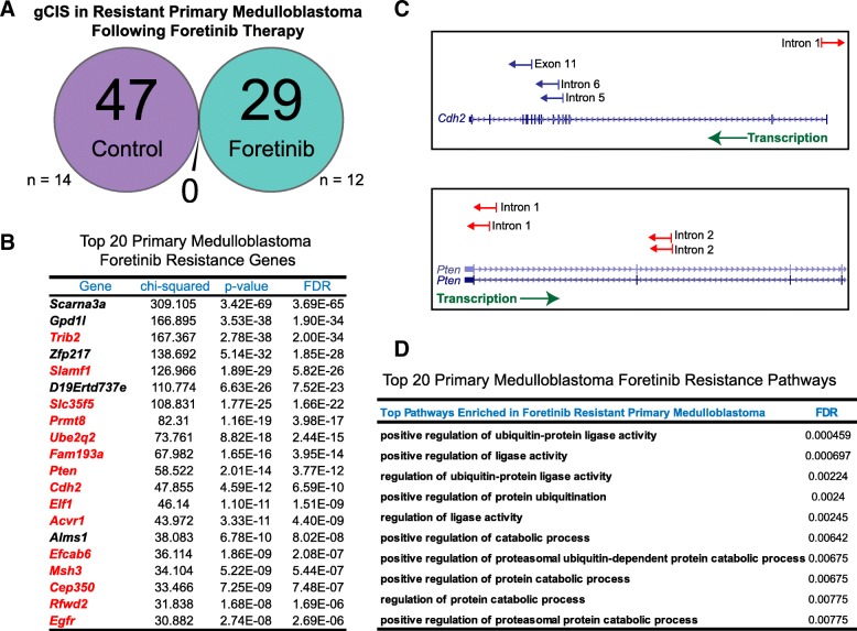 我们利用Sleeping Beauty转座子系统来确定对Foretinib的耐药途径,这作为一种概念验证策略,可以应用于其他癌症模型和系统。在原发性髓母细胞瘤中,用Foretinib治疗的小鼠中的gCISs模式与对照小鼠高度不同,因此支持原发性髓母细胞瘤的潜在机制与接受Foretinib治疗的肿瘤不同(图2a)。在经Foretinib治疗的原发性肿瘤中,我们在已知的肿瘤癌基因和抑癌基因如Pten,Cdh2,Egfr和Acvr1b中确定了特异性插入(图2a-c)。作为两个例子,通过PTEN插入的位置和反义方向在引入早期poly A转录终止信号的基因的5'末端内,评估PTEN插入是失活突变。预计CDH2插入会促进CDH2的小异构体的表达和/或消除基因的长异构体的表达。与癌症数据库中的《体细胞突变目录》相比,这些候选物中的大多数已被证明在癌症中发生了突变,并且其中一些先前已被证明与脑肿瘤发生有关(图2b)。此外,在原发部位肿瘤中介导福瑞替尼耐药的机制被蛋白质代谢相关的途径过度代表,特别是泛素介导的蛋白质降解(图2d)。我们的发现表明,患有髓母细胞瘤并接受Foretinib治疗的小鼠表现出与原发灶不同的途径改变。通过Sleeping Beauty转座子插入分析确定的这些途径代表了Foretinib抗性髓母细胞瘤的候选驱动因素和潜在靶标。