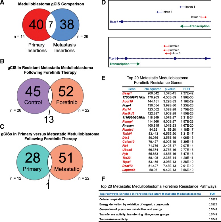 从历史上看,转移性疾病被认为与原发肿瘤高度相似,因此据推测对旨在针对原发性病变的治疗具有同等的反应。使用Sleeping Beauty转座子系统,我们显示原发性和转移性髓母细胞瘤表现出不同的遗传改变模式(图3a,附加文件1:表S1-S4)。在原发性髓母细胞瘤中鉴定出的gCISs包括转录调节剂(例如Crebbp和Ep300)以及转移性髓母细胞瘤中与免疫反应相关的基因(例如C6,A2m和Pkp2)(附加文件1:表S5-S8)。这些数据支持髓母细胞瘤的主要和转移区室由不同的分子机制驱动。接下来,我们询问与原发性治疗的肿瘤相比,转移性髓母细胞瘤是否可能发展出不同的或会聚的耐药途径。我们发现接受福瑞替尼治疗的转移性髓母细胞瘤与载体治疗的小鼠的转移隔室相比表现出不同的基因组插入模式(图3b)。此外,转移性gCIS与小鼠的原发区室高度不同,小鼠也接受了Foretinib治疗(图3c)。耐受Foretinib的转移性成神经细胞母细胞瘤插入物包括Basp1,Flt4,Mllt10和Asxl2(图3d,e)和参与细胞代谢的途径(图图3f)。这些发现表明原发性和转移性髓母细胞瘤在分子上是不同的。因此,它们对治疗的反应和耐药性可能会大相径庭。此外,我们证明了功能基因组作图的功效,可同时识别不同肿瘤区室中肿瘤发生的推定驱动器。