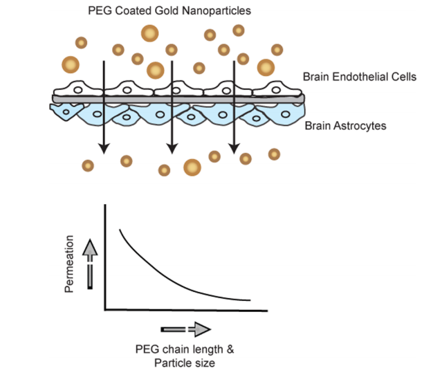 在本文中报告了由Kerabeber等人的研究,在静脉内全身输送金纳米颗粒后,归纳耦合等离子体质谱(ICP-MS) 用于量化SERS治疗GBM 对纳米颗粒的吸收细胞。作者表明,只有约 0.8% 的注射剂量每克肿瘤的 SERS 粒子数组织被发现在肿瘤,这是相对较小的部分。网状内皮系统的清除可能会减少,在某种程度上,通过镀金带有聚乙烯的纳米颗粒乙二醇 (PEG)。此外,可以想象作者可能有在实验中实现了更高百分比浓度的金二氧化硅 SERS 纳米粒子GBM 肿瘤,如果他们之前已经操纵了血脑屏障静脉给药SERS纳米粒子。BBB 是一种高度选择性但包含脑毛细血管内皮的可渗透细胞基质,通过紧密连接连接的细胞与星形细胞分离的足部过程由一个明确定义的基底膜。对于穿过 BBB 的治疗剂,它们需使用被动或主动运输机制。很久以前就知道,小的非较性亲脂剂将很容易穿过 BBB,而较性或水基化合物将需要主动传输机制。BBB的体外模型具有被开发用于测试金纳米粒子的渗透性。Etame 等人已证明大小依赖性渗透PEG 包覆的金纳米粒子,其中较小的重要尺寸金纳米粒子与较短的PEG 链长部分导致BBB 的较佳渗透(图3)。